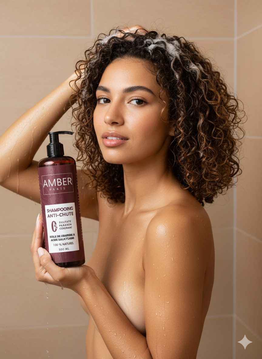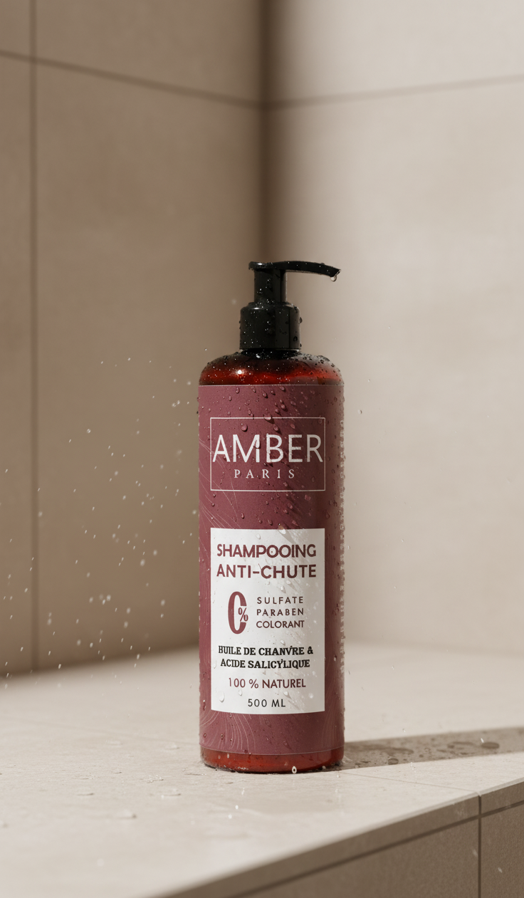 Amber Paris Anti-Hair Loss Shampoo – 100% natural, sulfate-free care enriched with hemp oil & salicylic acid to strengthen, cleanse & prepare hair for protein repair.